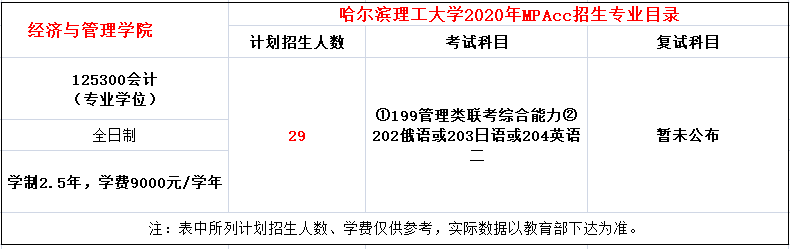 哈尔滨理工大学2020年硕士研究生招生简章现已公布。哈尔滨理工大学2020年MPAcc全日制学费每年9000元,学制2.5年,招生29人。