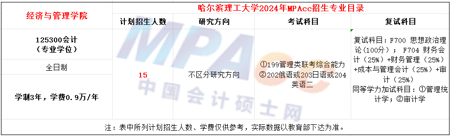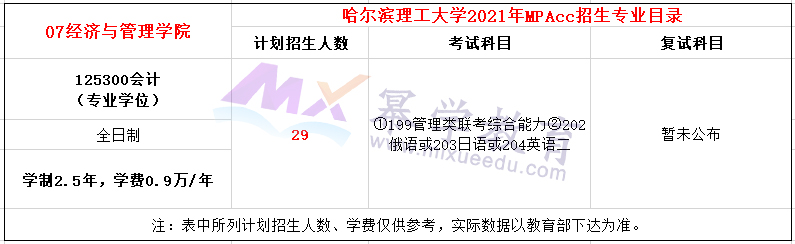 哈尔滨理工大学2021年MPAcc项目全日制计划招生29人,学费每年9000元,学制2.5年。