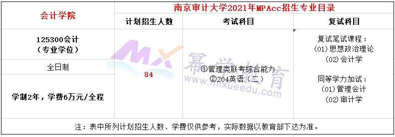 南京审计大学2021年MPAcc项目全日制计划招生84人,学费全程6万元,学制2年。