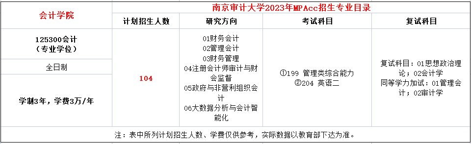 南京审计大学2023年MPAcc全日制计划招生104人,学费每年3万元,学制3年。