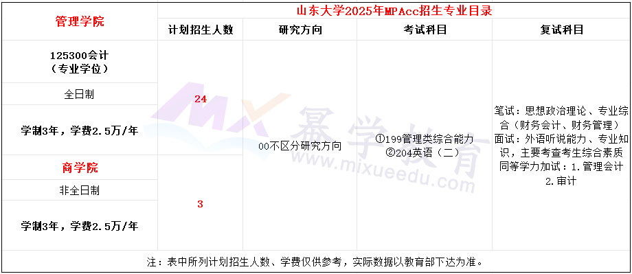 山东大学2021年MPAcc全日制计划招生19人,学制2-3年。