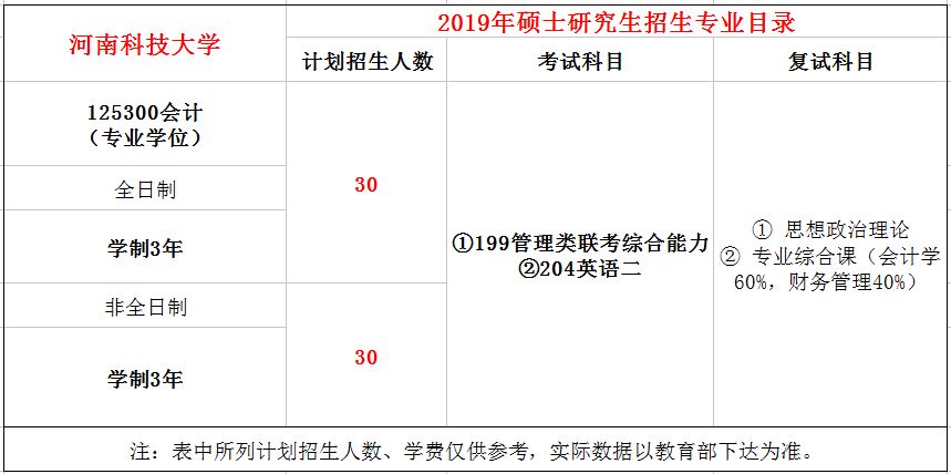 河南科技大学2019年MPAcc全日制和非全日制各招收30人,学制均为3年。