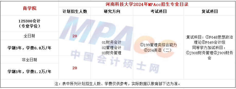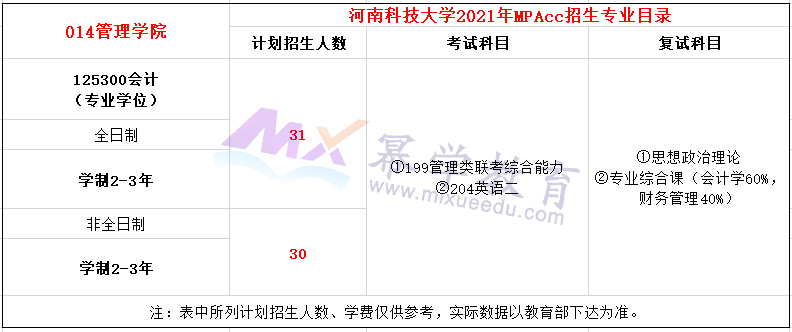 河南科技大学2021nian年MPAcc项目全日制计划招生31人,非全日制计划招生30人,学制2-3年。