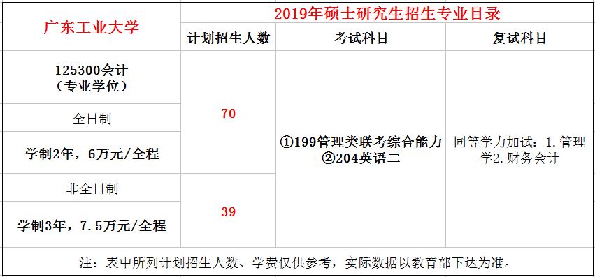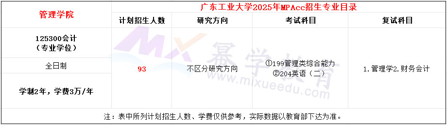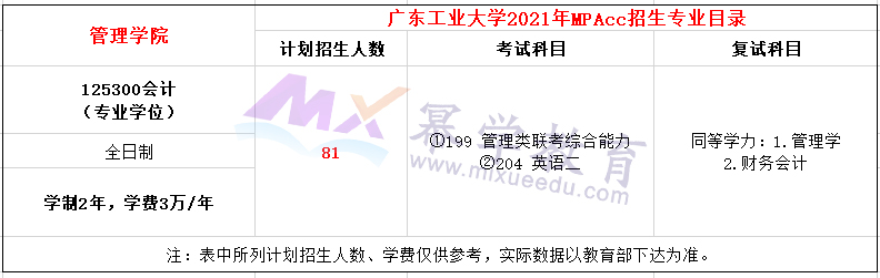 广东工业大学2021年MPAcc全日制招生81人,学费每年3万元,学制3年。