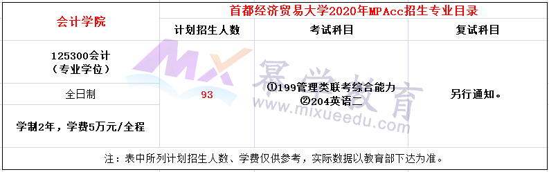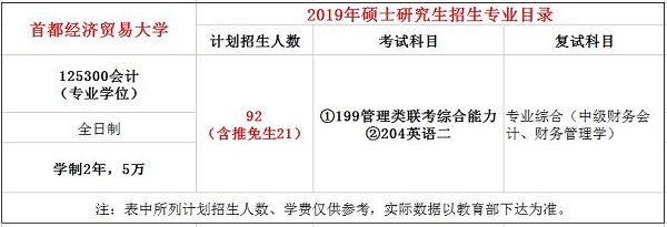 每科考试时间为3小时;各专业具体考试科目,请参考“首都经济贸贸易大学2020年研究生招生专业目录及考试科目”。