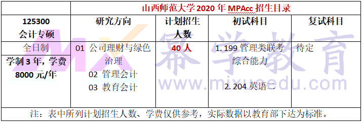 山西师范大学发布2020年MPAcc招生简章,计划招收全日制MPAcc硕士40人,学制3年,学费8000元/年。
