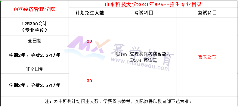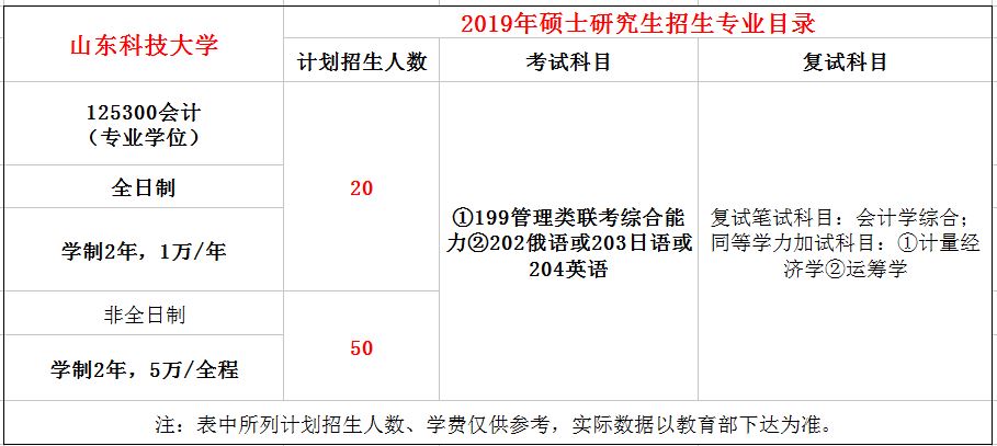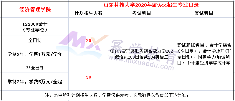 山东科技大学2020年硕士研究生招生简章现已公布。山东科技大学2020年MPAcc全日制招收20名,学费每学年1万元;非全日制招收30名,学费全程5万元。