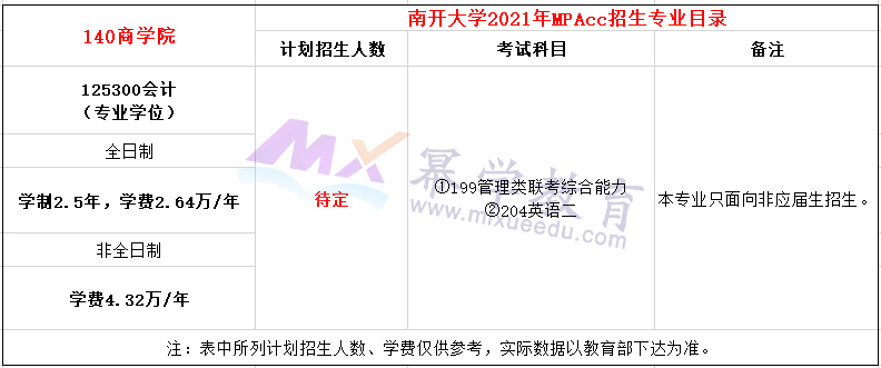 华南师范大学2021年MPAcc学费:人民币22000元/生·学年;全日制计划招生92人,非全日制计划招生20人。