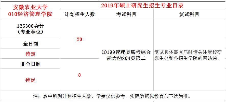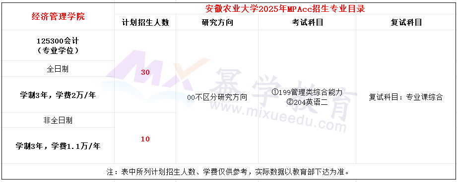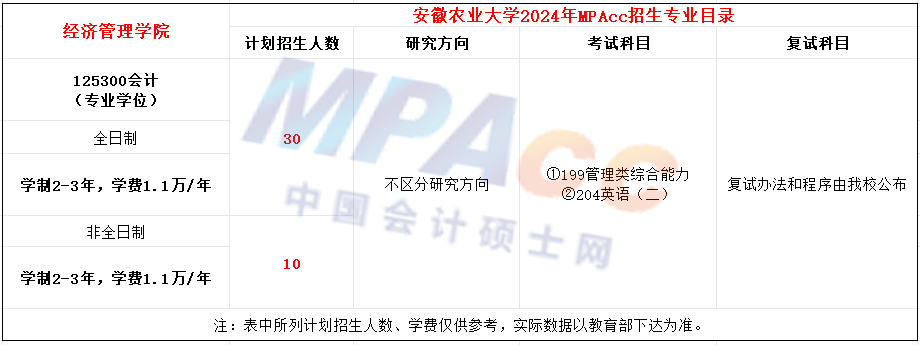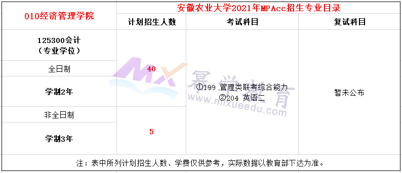 安徽农业大学2021年MPAcc全日制计划招生40人,学制2年;MPAcc非全日制计划招生5人,学制3年。