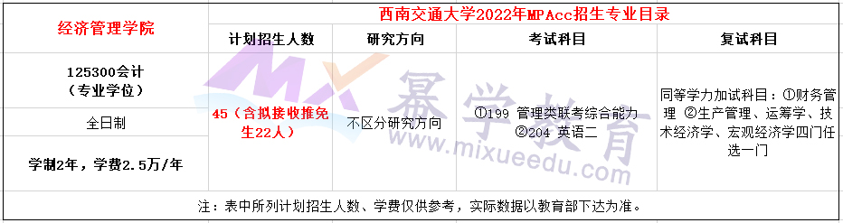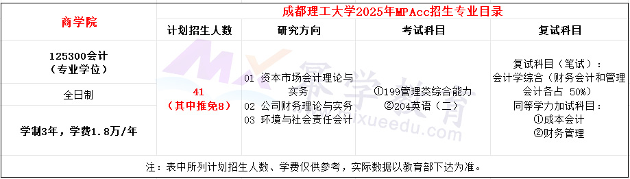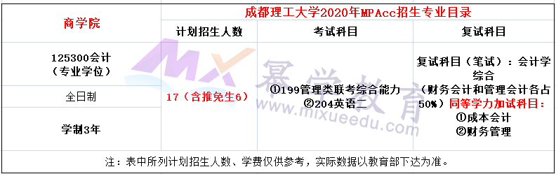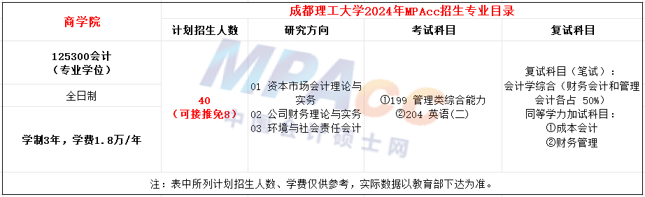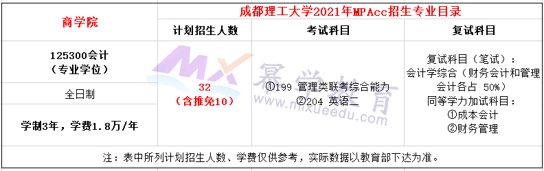 成都理工大学2021年MPAcc全日制计划招生32人,学费每年18000元,学制3年。