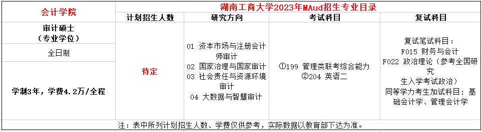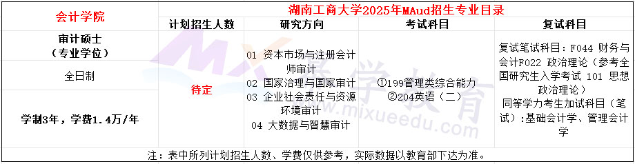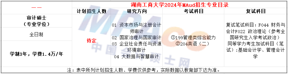 湖南工商大学2025年硕士研究生招生简章已公布,2025年MAud审计专硕全日制学费1.4万/年,学制3年。