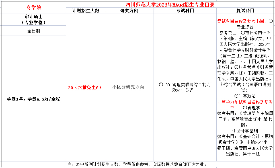 四川师范大学2021年MAud项目全日制计划招生27人,非全日制计划招生20人,学费每年15000元,学制3年。