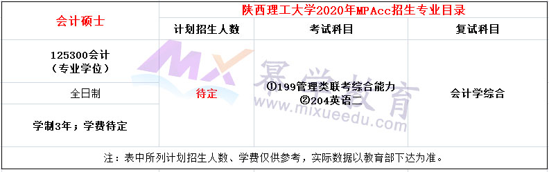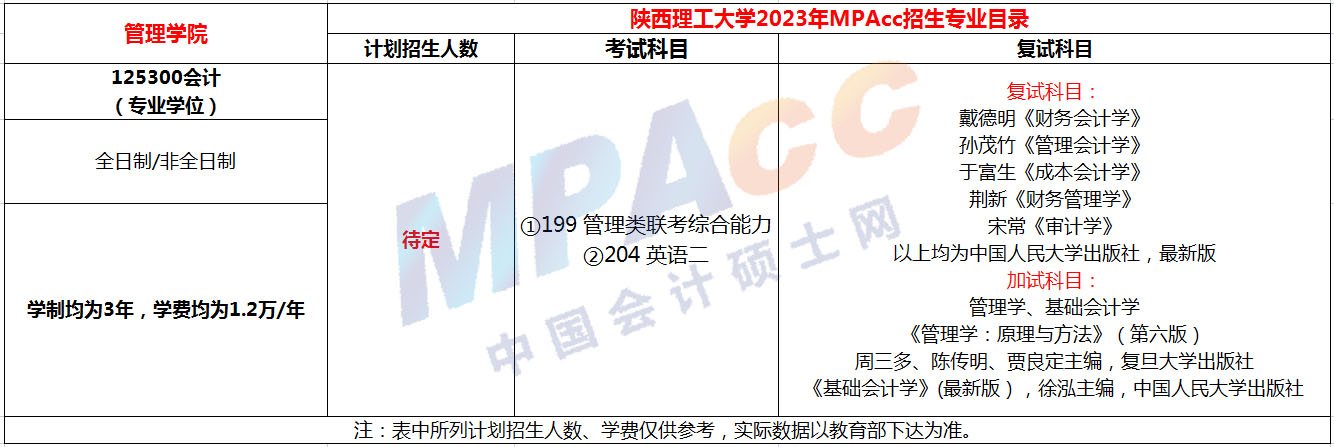 陕西理工大学2024年MPAcc全日制/非全日制学费12000元/生/年,学制3年,招生人数暂未公布。