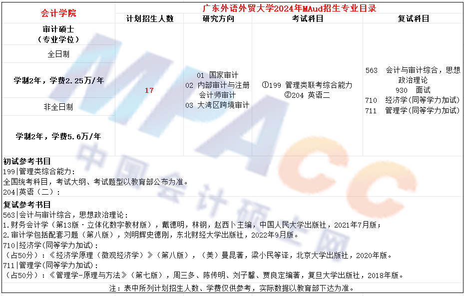 广东外语外贸大学2024年硕士研究生招生简章及招生目录已公布,MAud审计专硕招生17人,全日制学费每年22500元,非全日制学费每年56000元,学制均为2年!