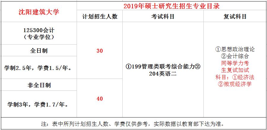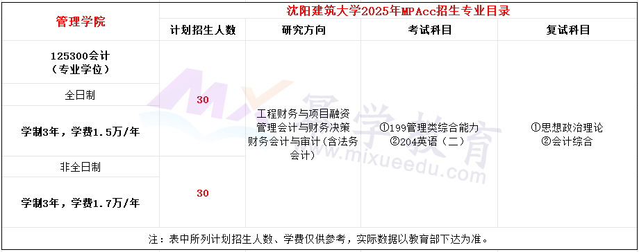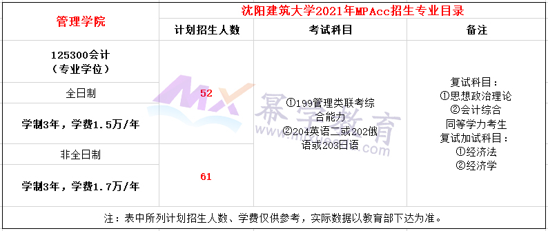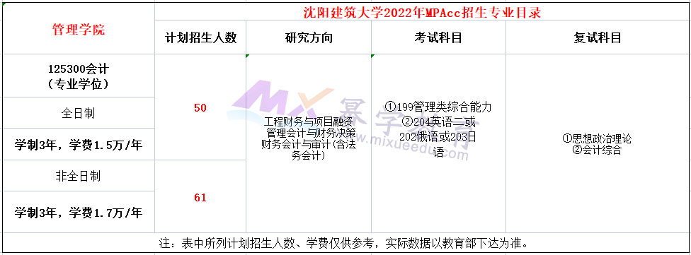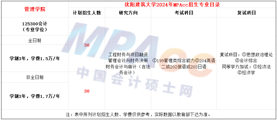 沈阳建筑大学2024年硕士研究生招生简章已公布,2024年MPAcc会计专硕全日制计划招生30人,学费每年15000元,学制3年;非全日制计划招生30人,学费每年17000元,学制3年。