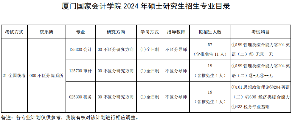 我院2024年拟招收全日制专业学位硕士研究生共计95名(含统考生和推免生),其中会计硕士(代码125300)拟招收57人,审计硕士(代码125700)拟招收19人,税务硕士(代码025300)拟招收19人,招生计划详见《厦门国家会计学院2024年硕士研究生招生专业目录》(该计划仅供考生参考,各专业最终录取人数将视教育部正式招生计划下达数、推免生录取人数、生源状况和学院发展需要等情况进行适当调整)。