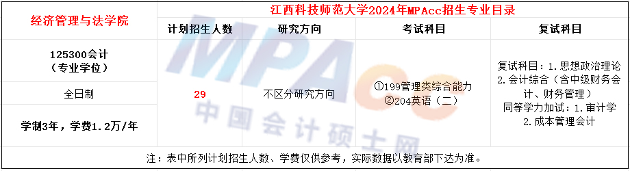 江西科技师范大学2024年硕士研究生招生简章已公布,2024年MPAcc会计专硕全日制计划招生29人,学费每年12000元,学制3年。