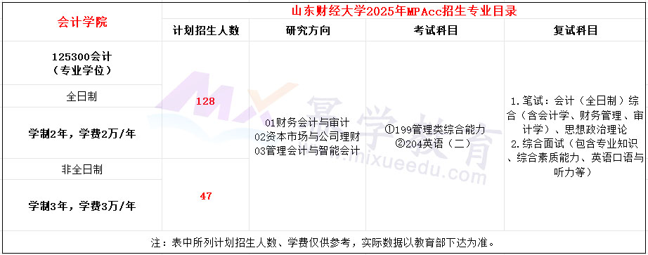 山东财经大学2025年硕士研究生招生简章已公布,2025年MPAcc会计专硕全日制学费2万/年,学制2年,计划招生128人。非全日制学费3万/年,学制3年,计划招生47人。
